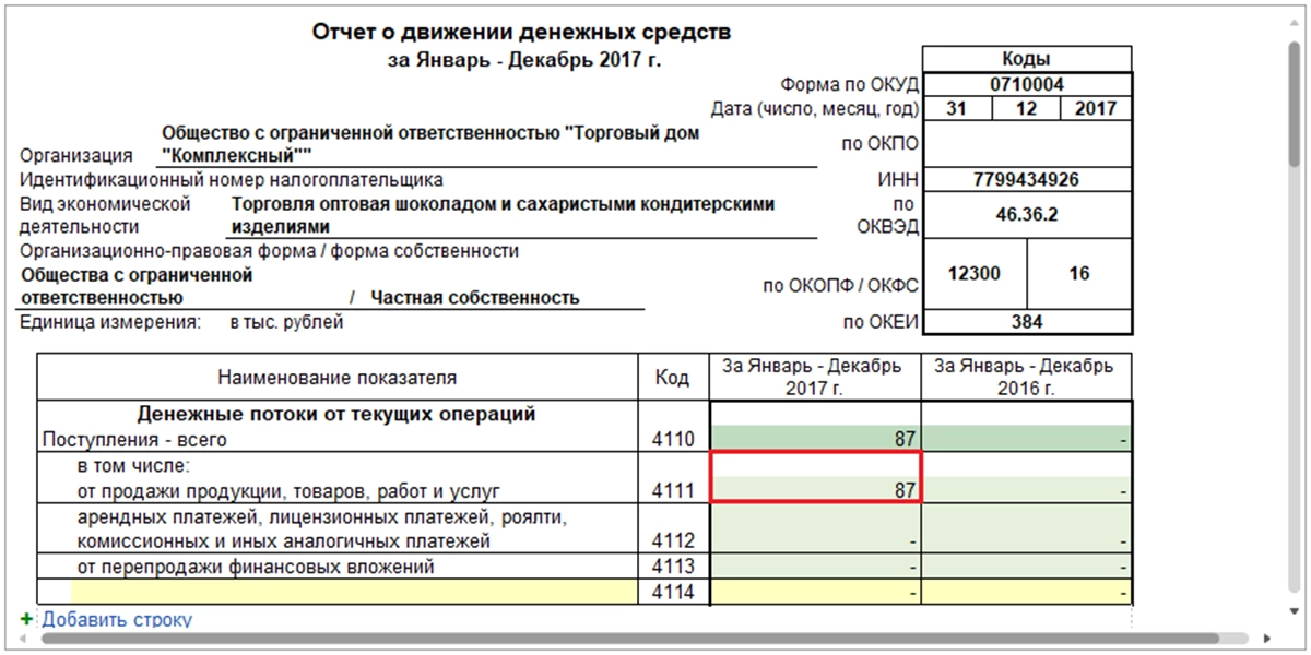 Таким образом, зарегистрированная оплата от покупателя по статье ДДС с видом движения «Поступление от продажи продукции и товаров, выполнения работ, оказания услуг» на форме №4 отчета попадет в состав итоговой суммы по строке 4111 «Поступления от продажи…».