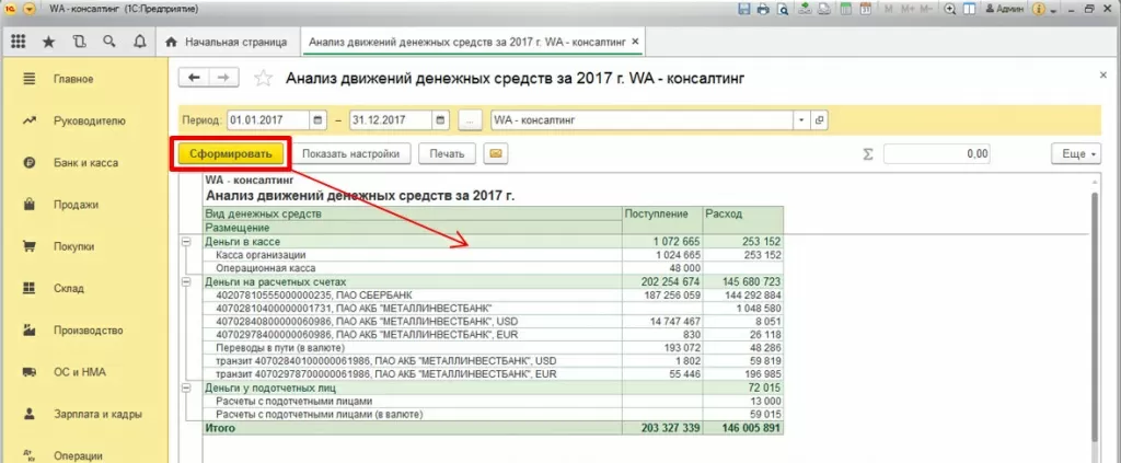 Аналитика отчета ДДС позволяет оценить денежные потоки каждого расчетного счета предприятия. По данному отчету можно отслеживать общую динамику денежных средств в разрезе валют.
