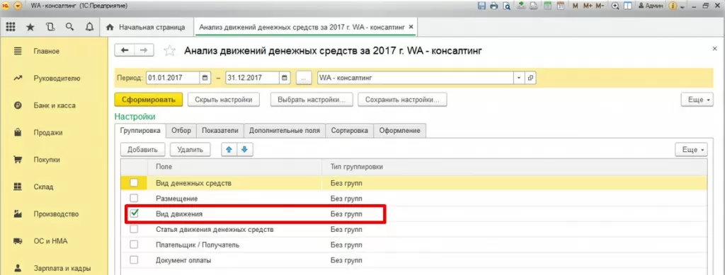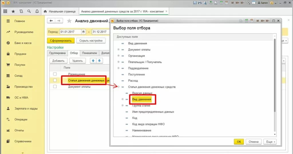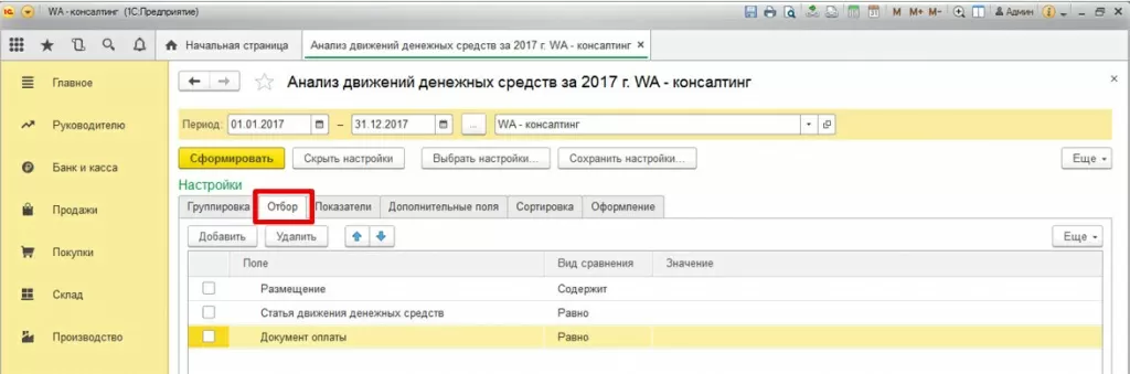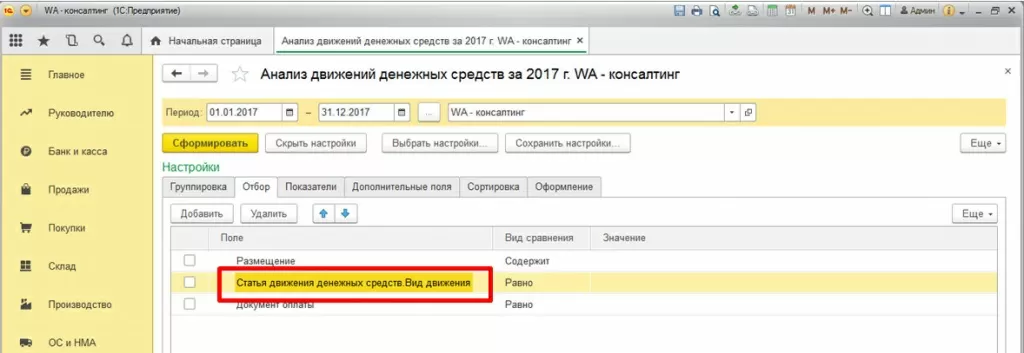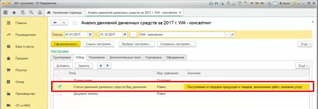 На закладку «Отбор» можно добавлять те же поля, что и на закладку «Группировка», но указывать необходимые конкретные значения, чтобы в отчет выводилась отфильтрованная информация. К примеру, мы хотим увидеть поступления от покупателей. В начале статьи мы говорили про вид движения денежных средств: установим отбор по нему.