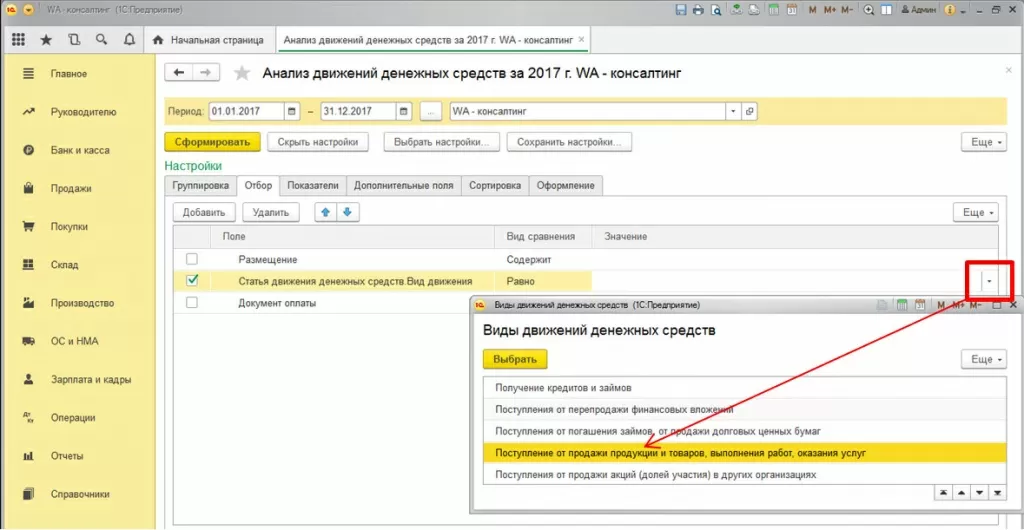 Установим значение, по которому необходимо провести отбор. Для поступления от покупателей это значение – Поступление от продажи продукции и товаров, выполнения работ, оказания услуг.