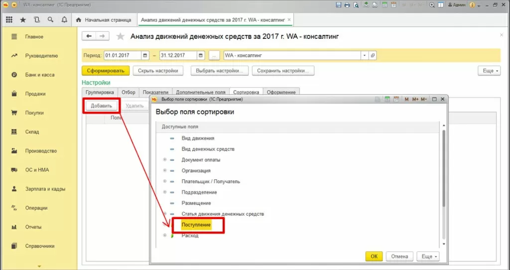 Выберем поле «Поступление» для сортировки и установим значение «По возрастанию».