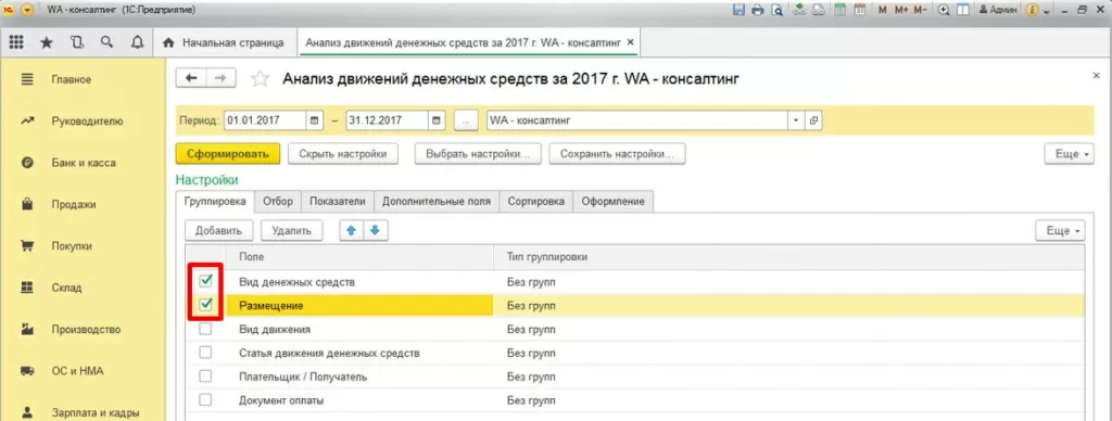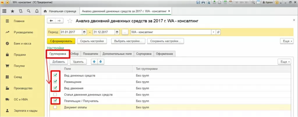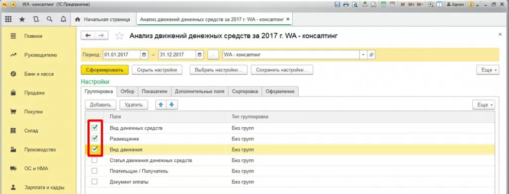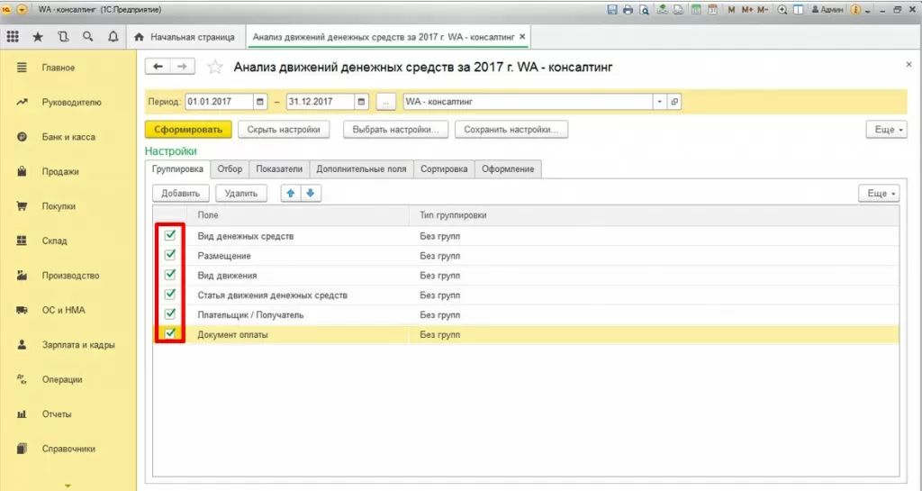 Таким образом, на закладке «Группировка» настроек отчета ДДС мы управляем видимостью тех или иных полей отчета. Также, мы можем установить видимость для всех группировочных полей, чтобы увидеть максимальные возможности.