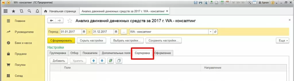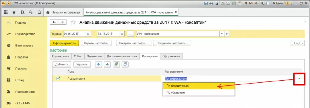 Продолжим оптимизацию настроек предыдущего отчета ДДС. Нам необходимо вывести все поступления денежных средств не случайным образом, а по возрастанию.