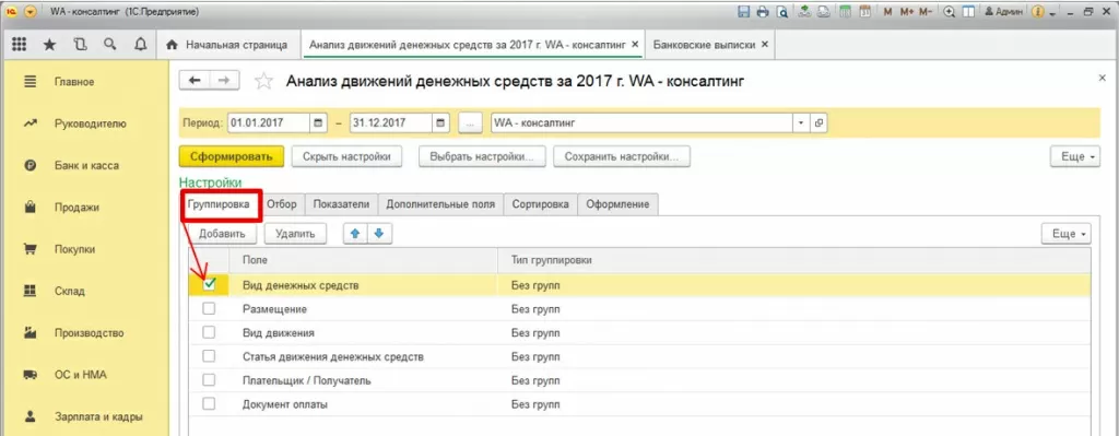 На первой закладке «Группировка» расположены все возможные поля, данные по которым выводятся в отчет. Установим первое значение – группировку по виду денежных средств.