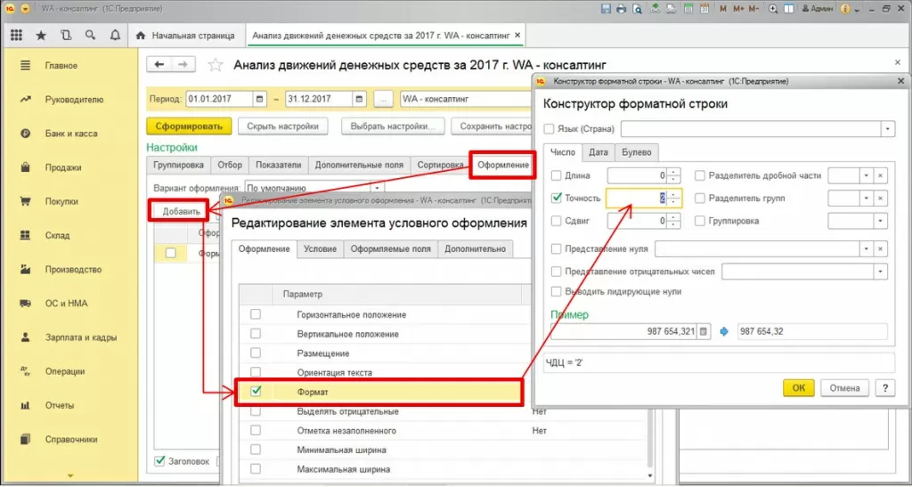 По умолчанию отчет ДДС формируется с округлением до рублей. Если вдруг возникнет необходимость сформировать его с точностью до копеек, это можно сделать с помощью последней закладки настроек – «Оформление». Ниже на скриншоте иллюстрация последовательности действий: переходим на закладку «Оформление», добавляем строку «Формат», устанавливаем ей нужную «Точность»: