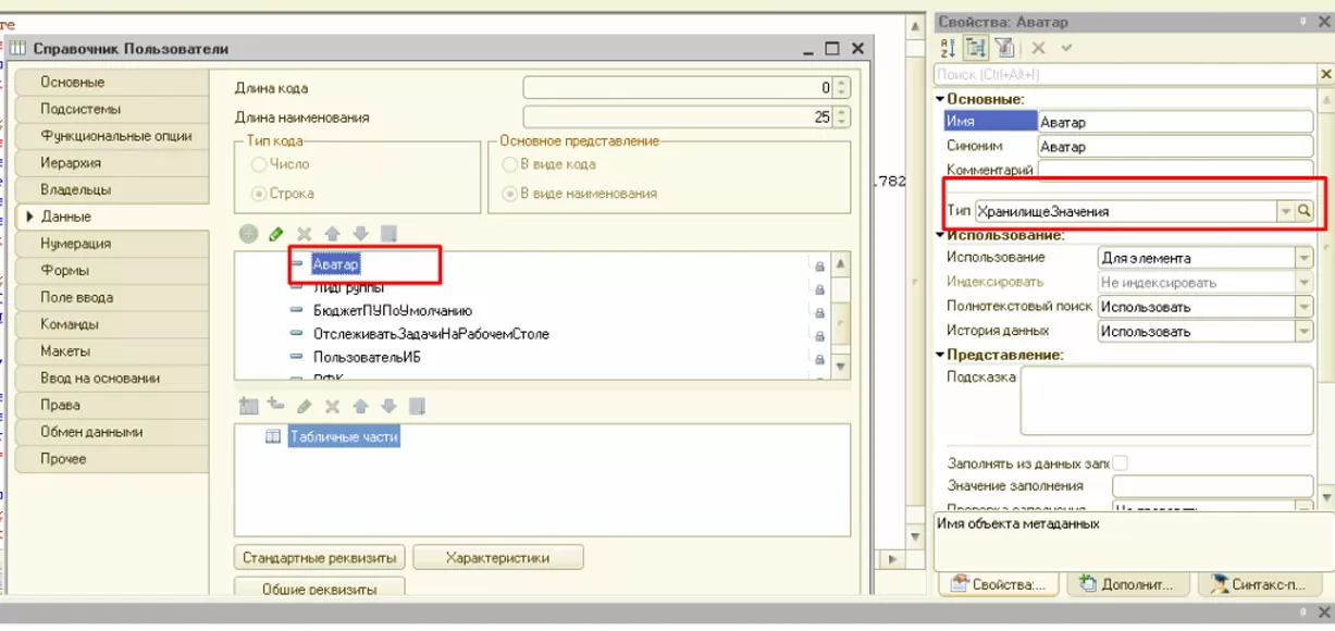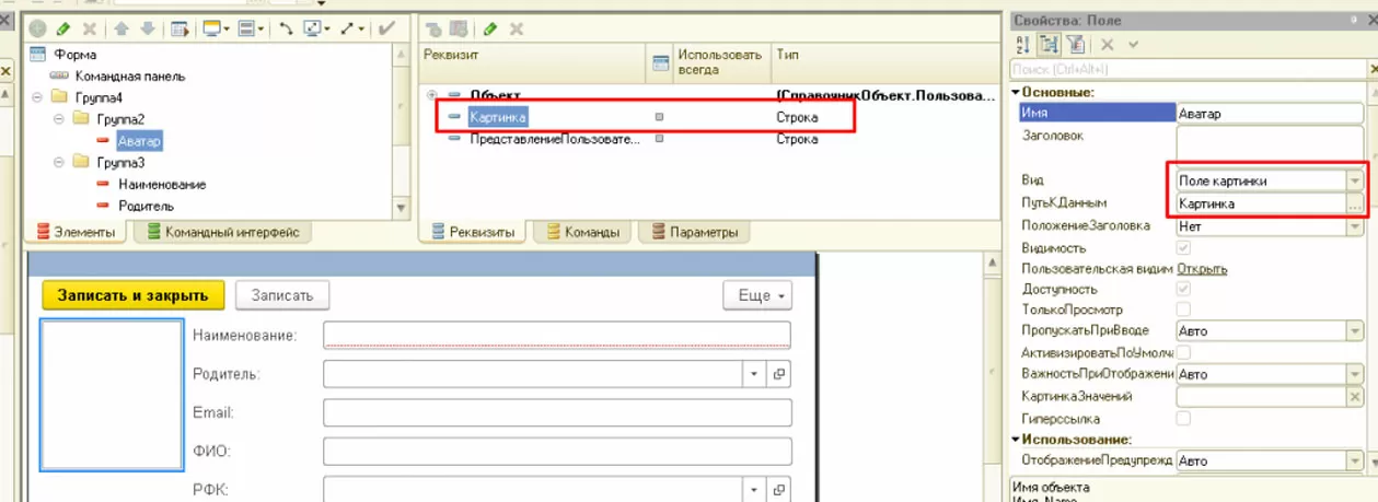 Теперь у нас в реквизите «Аватар» лежат двоичные данные картинки. Чтобы картинку вывести на управляемую форму, необходимо добавить реквизит формы «Тип строка», перекинуть его на форму (drag-and-drop), либо создать самостоятельно элемент формы, указав в поле «Путь к данным» наш реквизит «Картинка», после чего изменить вид на «Поле картинки».