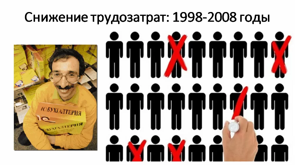 На этой картинке изображен Борис Георгиевич примерно в 1998 году, когда фирма 1С стала достаточно быстро развиваться и отвоевывать позиции у прочих прекрасных игроков того рынка (типа Турбобухгалтера, Инфобухгалтера – если кто-то помнит эти продукты). На тот момент времени, действительно, когда мы (и я в том числе) с продуктом 1С приходили на предприятие, эффект от внедрения даже бухгалтерской системы был очень большой. Можно было так же, как показано на картинке, всех сокращать, увольнять, уходить от журнал-ордерной формы учета и прочих прекрасных вещей. Где-то с 1998 до 2005 года эффекты были очень сильные.