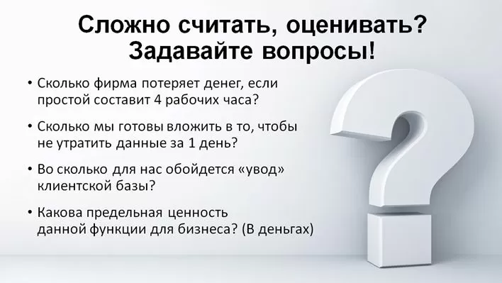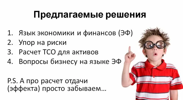- Ну и наконец, когда мы освоим язык экономики и финансов, сможем оперировать рисками и считать ТСО, это позволит нам правильно задавать вопросы бизнесу.