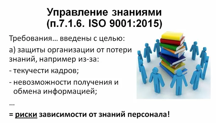 Все более актуальным вопросом становится управление знаниями, о котором я говорил с точки зрения эффектов. В том же стандарте менеджмента качества ISO 9001 редакции 2015 года, пункте 7.1.6 процитировано, что введены новые требования по управлению знаниями с целью защиты организации от потери знаний. Например, из-за текучести кадров, невозможности получения и обмена информацией вы несете риск потери знаний, риск зависимости от знаний персонала. Это очень важный на сегодня вопрос, опять же, уже переходящий в область широко распространенных стандартов. Поэтому о данном эффекте можно говорить с бизнесом. Если вы: