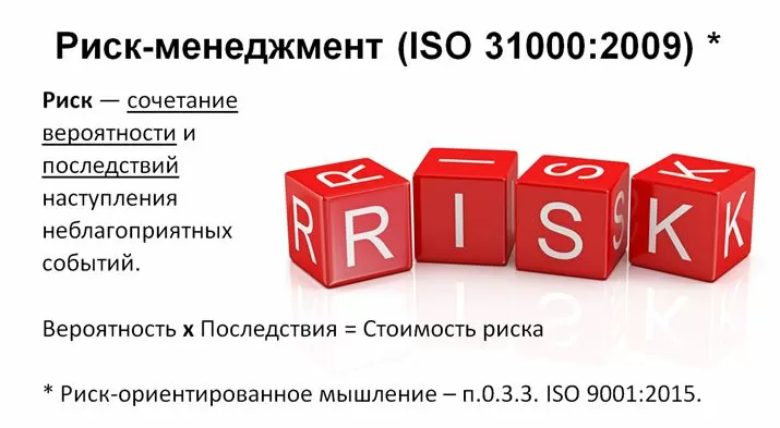 Очень важно, что в стандартах по менеджменту качества (всем известный ISO 9001), в редакции 2015 года появилось требование о внедрении в организации так называемого риск-ориентированного мышления. Это процитировано в пункте 0.3.3 в новой версии стандарта ISO 9001:2015. А поскольку стандарт менеджмента качества наиболее распространен с точки зрения сертификации на территории нашей страны, теперь понятие риск-менеджмента стало к нам гораздо ближе. Теперь риск-менеджмент подтянут к требованиям, которые организация должна обеспечить, чтобы аудиторы могли подтвердить ее соответствие стандарту ISO 9001:2015.