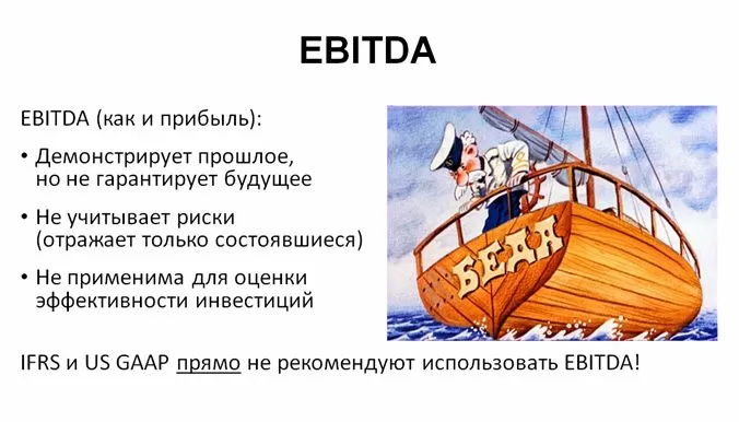 В заголовке доклада был заявлен такой модный термин, как EBITDA. Сразу скажу, что в международных стандартах финансовой отчетности IFRS и US GAAP есть прямые письменные указания не использовать в оценке деятельности компании такой показатель, как EBITDA. Поэтому долго рассказывать про то, что это такое, я вам не буду. Это термин для финансовых рынков. Сравнительный, внутриотраслевой. Нам с вами он не нужен. Можно упростить, что EBITDA равно прибыль.