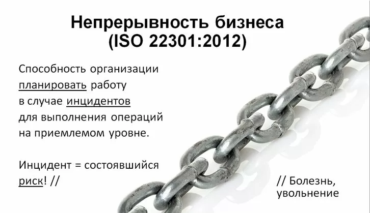 Непрерывность бизнеса – это другой очень важный стандарт ISO 22301. Его не все ИТ-шники знают, но многие оперируют этими понятиями. Этот стандарт означает способность организации планировать работу в случае инцидентов для выполнения операций на приемлемом уровне.