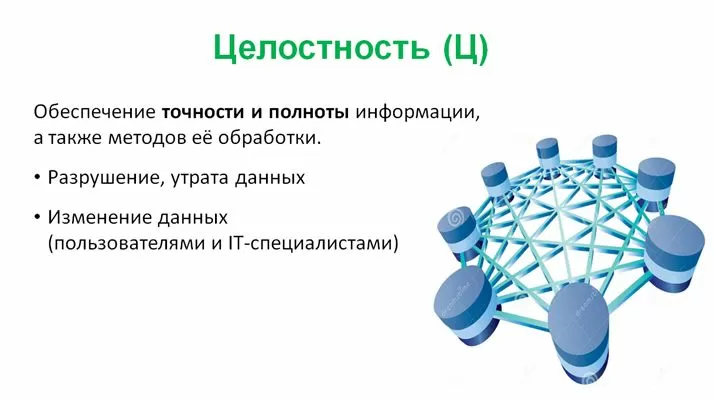 Целостность – это обеспечение точности и полноты информации, а также методов ее обработки. Речь о: