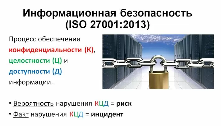 Информационная безопасность – это процесс обеспечения конфиденциальности, целостности и доступности информации. Три слова – конфиденциальность (К), целостность (Ц) и доступность (Д). Теперь в привязке к риск-менеджменту: