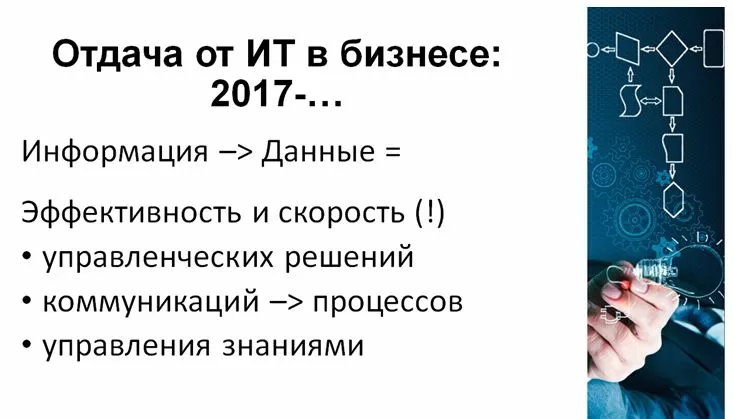 Я собираюсь поговорить о том, что волнует бизнес. Сегодня звучит очень много новых неизвестных сложных слов, и когда вы с этими словами приходите к бизнесу, он вас не понимает. А вы в свою очередь не всегда понимаете бизнес. Но я хочу, чтобы позиции бизнеса и IT-шников сближались, и считаю, что это движение должно быть двунаправленным. С одной стороны – бизнес должен научиться новым ИТ-технологиям, понять, как их можно применять в ходе своей работы и освоить их использование хотя бы на каком-то обзорном уровне, а вы, в свою очередь, должны постараться освоить язык экономики и финансов, на котором бизнес говорит и с помощью которого он принимает решения.