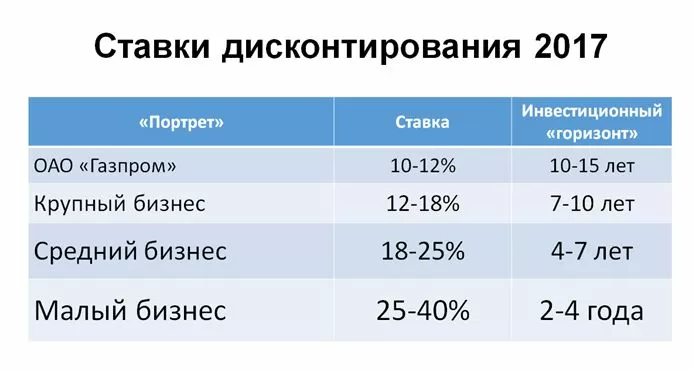Здесь показаны текущие ставки дисконтирования, которые актуальны на сегодняшний момент для собственного капитала бизнеса. Общий подход: чем крупнее бизнес, тем ниже его риски (так предполагается), тем больше у бизнеса способность привлекать капитал с рынка (в виде кредитования и прочих вещей), тем дешевле у него собственный капитал и тем дальше инвестиционный горизонт.