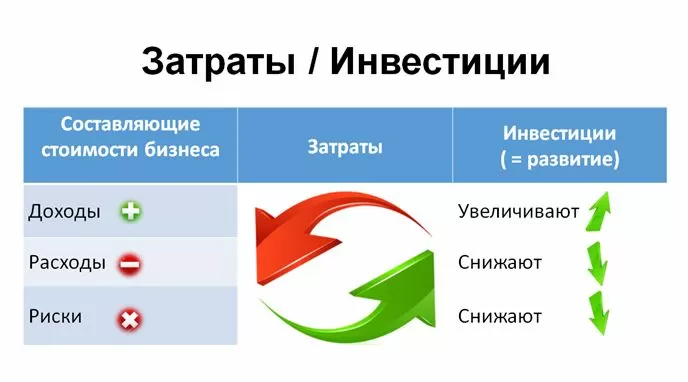 Граница между затратами и инвестициями проходит по влиянию этих денежных средств на доходы, расходы и риски. Распечатать и повесить – это очень важно.