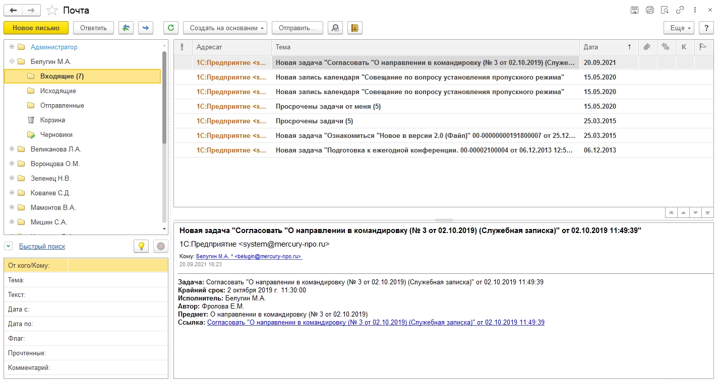 Встроенная почта. Полноценный клиент для работы с почтой, имеющий дополнительные возможности. Изначально является частью 1С:ДО.
