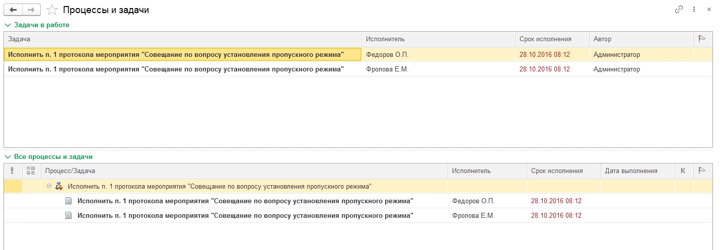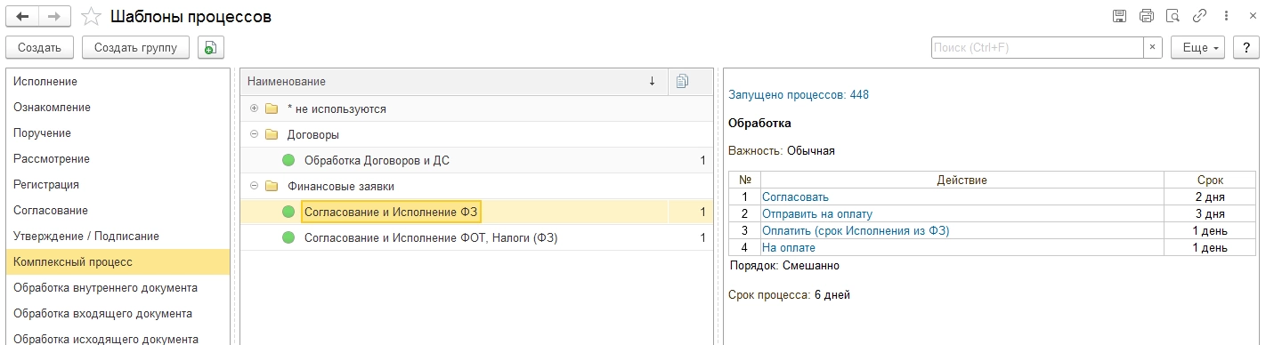 Процессы. «1С:Документооборот 8 КОРП» поддерживает механизм процессов – способ организовать совместную работу сотрудников. Процессы могут быть как элементарные (согласование, исполнение, ознакомление и т.д.), так и составными или вообще комплексными. При помощи комплексных процессов можно реализовать взаимодействие сотрудников любой сложности. Комплексные процессы состоят из любого количества элементарных и других комплексных процессов. Причем переходы от одного процесса к другому могут быть по заданным условиям. В процессах удобно использовать ролевую адресацию, это позволяет при изменении исполнителей продолжать использовать настроенные маршруты, особенно когда их много, и они достаточно сложные. Каждый процесс создает задачи для пользователей с указанием, что конкретно нужно сделать, с каким предметом, в какой срок.