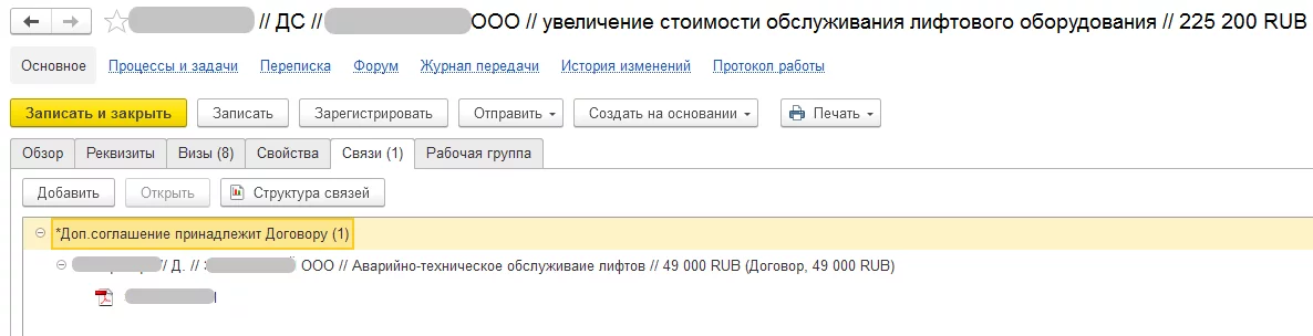 Связи. Любые электронные документы в СЭД могут быть связаны между собой через механизм связей. Связи бывают один к одному, один ко многим, многие ко многим. Как пример, связь Договор и его дополнительное соглашение (ДС), связываются один ко многим (один договор может иметь много ДС). И наоборот, ДС может принадлежать только к одному договору (связь много к одному), причем такую связь можно сделать обязательной (ДС не может существовать без договора). Все связи документа отображаются в карточке, и из него можно сразу перейти в другие документы.