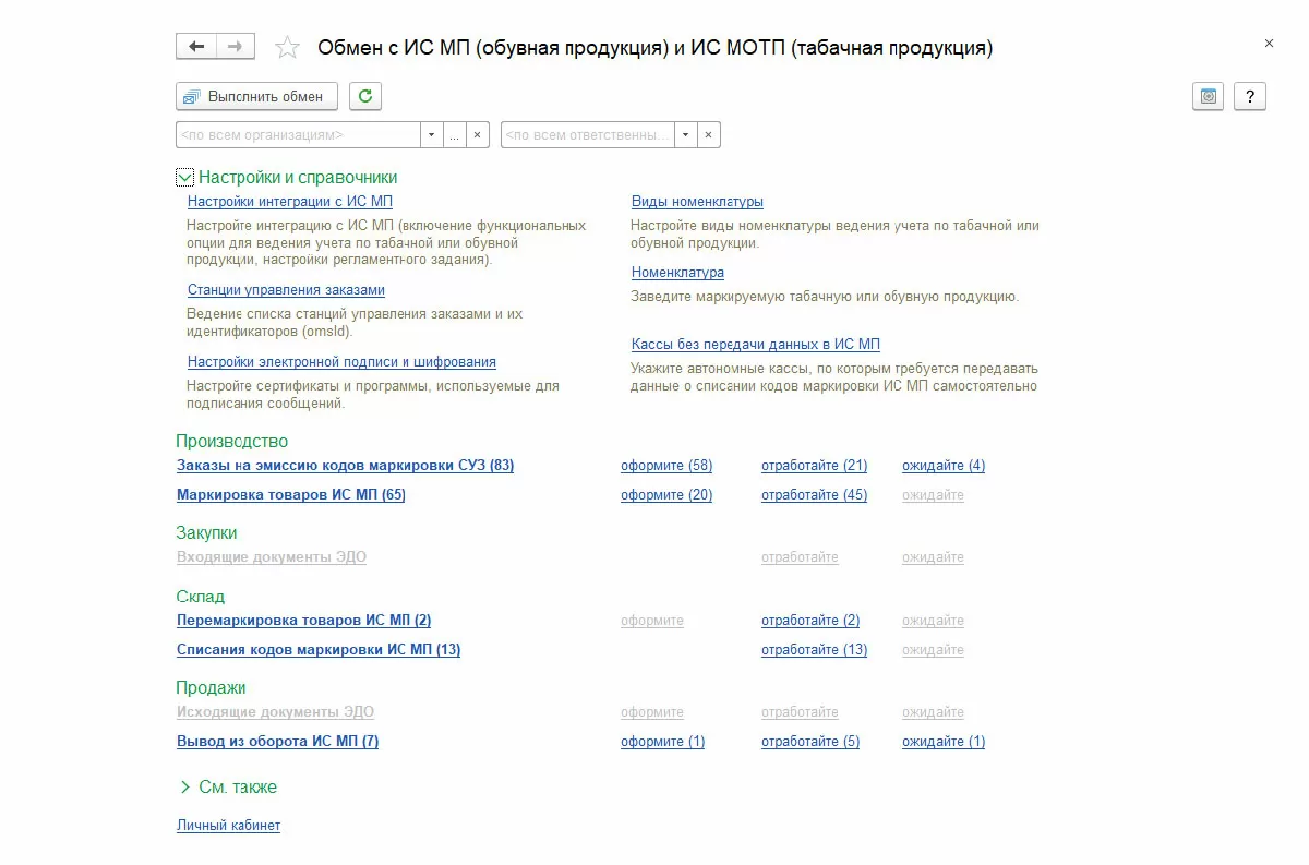 После интеграции в программе 1С появится окно взаимодействия с ИС «Маркировка».