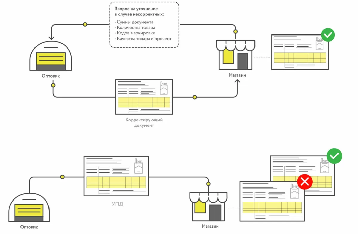 - Поставщик корректирует УПД и отправляет его магазину повторно.
