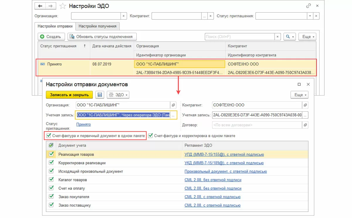 - Второй путь интеграции – через товароучетную программу 1С и встроенный сервис 1С-ЭДО.