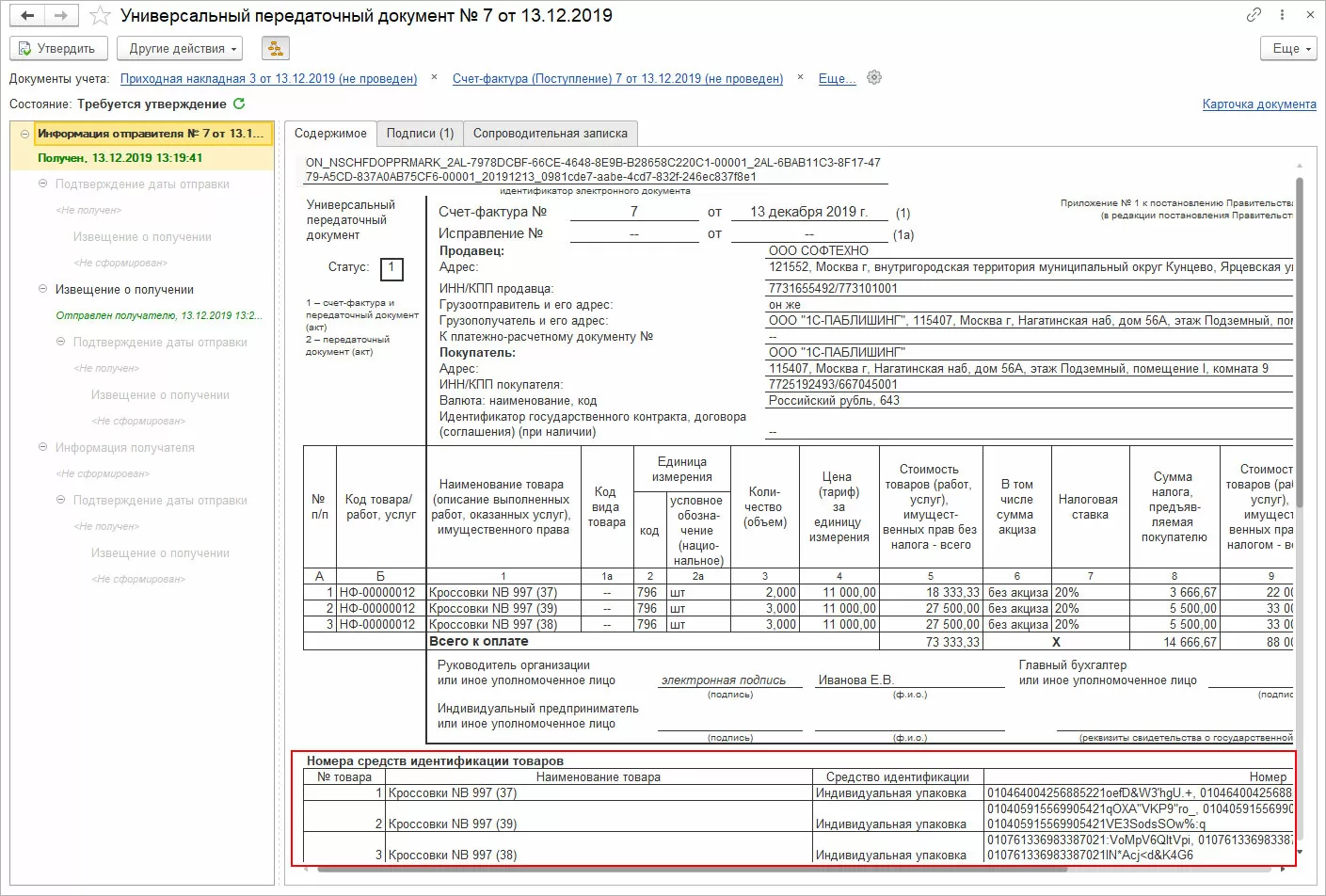 - В случае полного соответствия кодов полученного товара с кодами в УПД, магазин подтверждает документ. Если коды не совпадают, магазин может скорректировать УПД, провести частичную приемку или отклонить поставку.