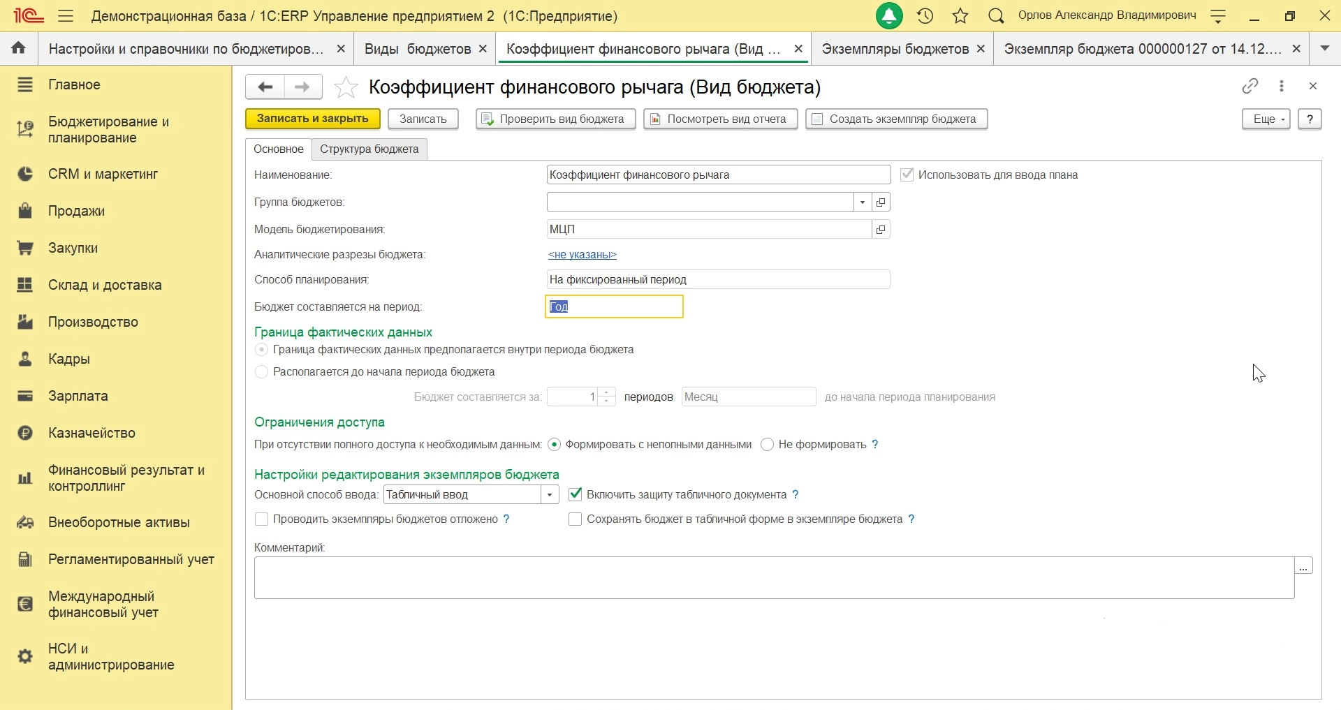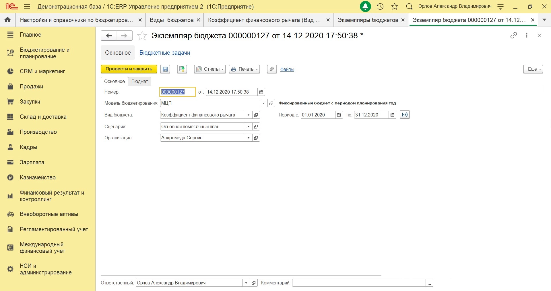 Завершаем редактирование и создаем «Экземпляр бюджета» из документа «Вид бюджета». Это также можно сделать в ручном режиме путем перехода в раздел «Бюджетирование и планирование-Бюджеты-Экземпляры бюджетов».