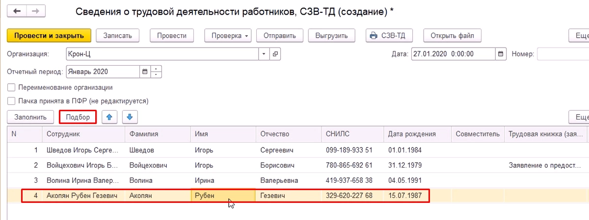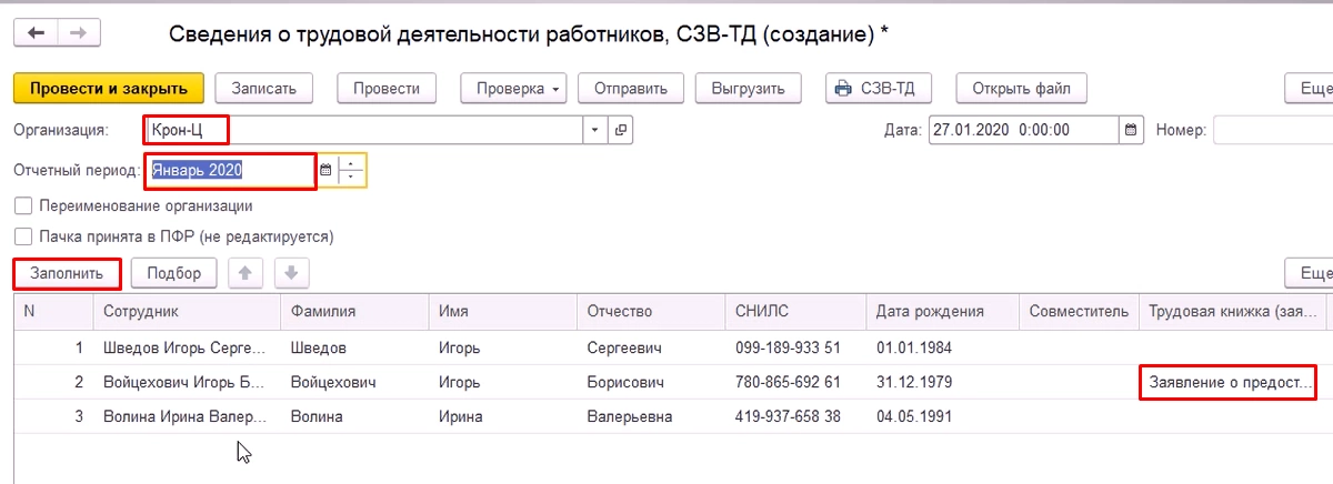 Если было подано заявление о дальнейшей форме ведения его трудовой книжки, его тоже нужно отразить в данном отчете. При условии, что по работнику были кадровые события в данном периоде, сведения о заявлении подтянутся в отчет автоматически. Если кадровых событий не было, то заявление надо будет добавить в документ вручную при помощи кнопки «Подбор».