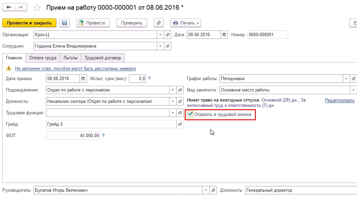 Работа в этой части в 1С ЗУП сводится к формированию двух вышеупомянутых форм отчетности – СЗВ-ТД и СТД-Р. Для того чтобы кадровые события попадали в данные отчеты через автозаполнение, необходимо проделать следующий алгоритм действий: в кадровых приказах (Прием, Перевод, Увольнение) активировать опцию «Отразить в трудовой книжке».