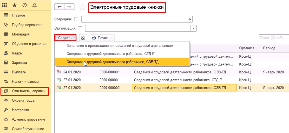В разделе «Отчетность, справки» перейдем в журнал «ЭТК», нажмем кнопку «Создать» и выберем нужную нам форму СЗВ-ТД.