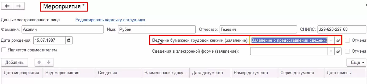 После добавления сотрудника по двойному щелчку мыши перейдем в меню «Мероприятия» и выберем в соответствующем поле заявление работника.