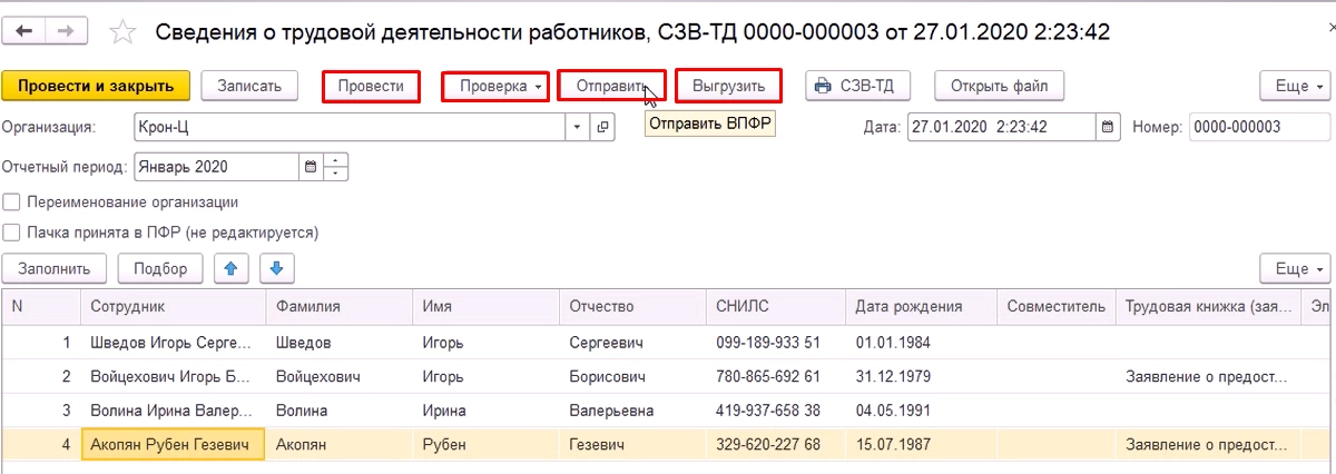 После заполнения документа его необходимо провести. Далее можно проверить корректность его заполнения при помощи кнопки «Проверка». Если подключен сервис 1С-ЭДО, документ можно отправить в СФР непосредственно из программы по кнопки «Отправить», либо выгрызть в файл при помощи кнопки «Выгрузить» и отправить через свою программу сдачи отчетности./p>