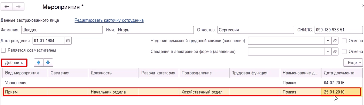 При первой подаче данных работодатель должен подать информацию о предыдущей записи в ТК. Для этого, как и при внесении данных о поданном заявлении, перейдем двойным кликом мышки в меню «Мероприятия» и при помощи кнопки «Добавить» внесем действующую на тот момент запись.