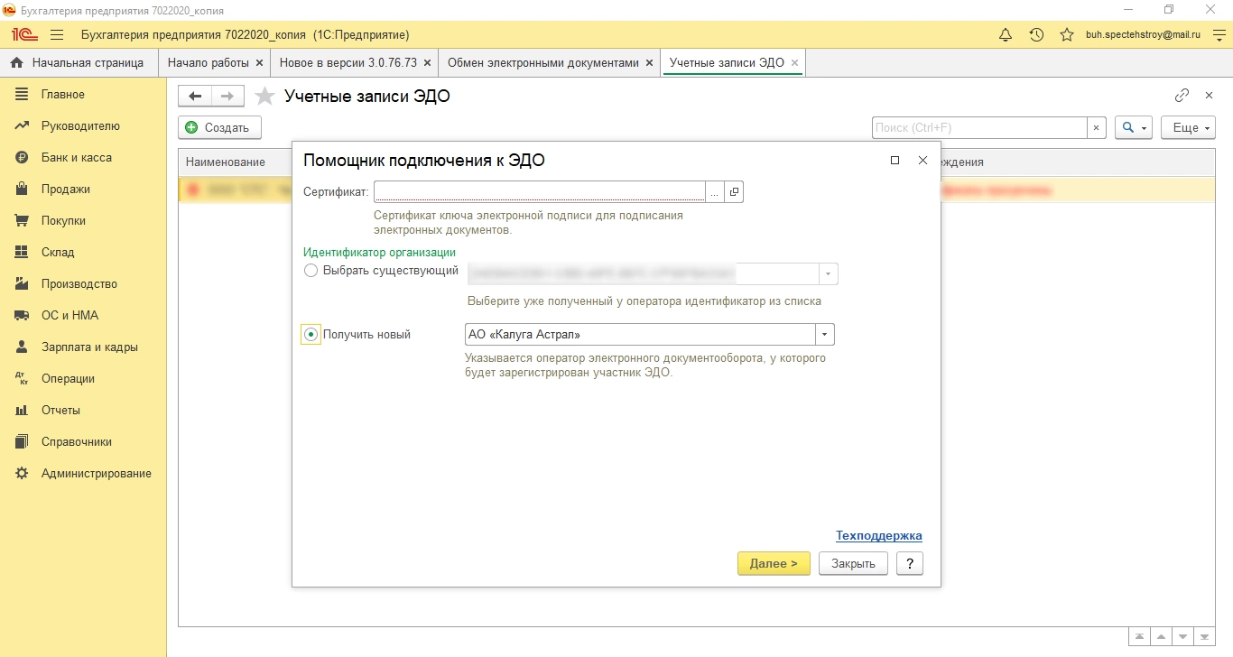 В профиле настроек ЭДО открывается окно «Помощник настройки прямого обмена с контрагентами», в котором последовательно заполняются поля идентификатора организации (он выдается при регистрации компании в системе ЭДО, его необходимо запросить у оператора передачи данных), способ обмена и сертификат.