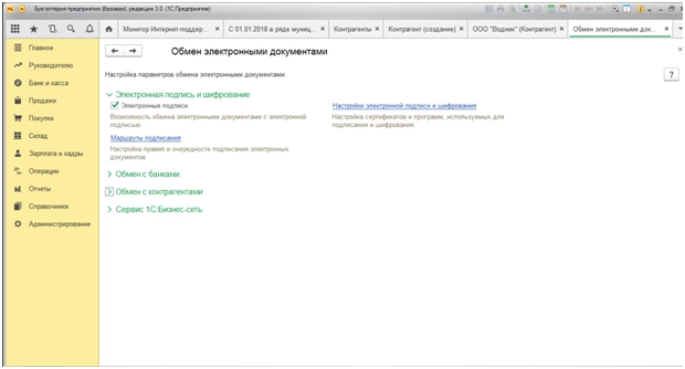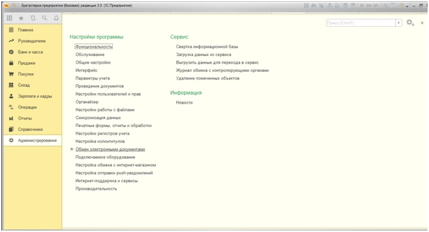 Далее необходимо перейти в меню «Администрирование – Обмен электронными документами».