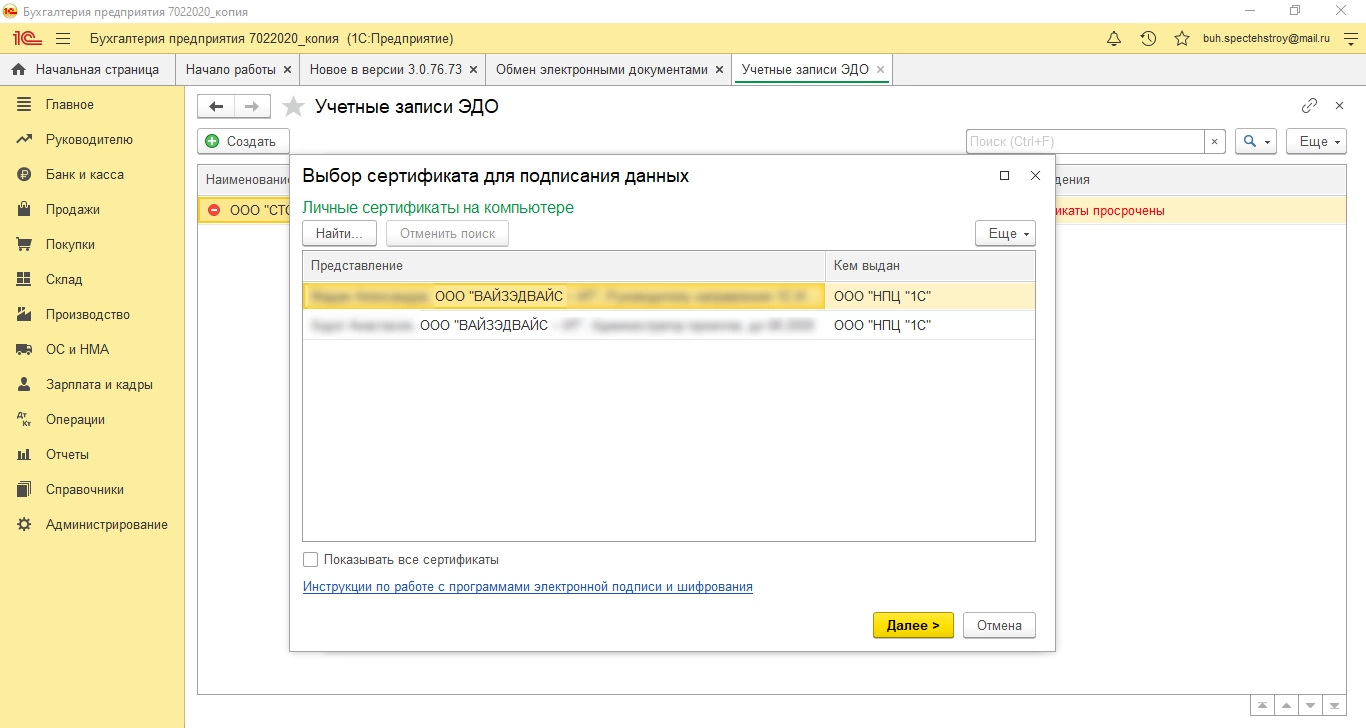 Важно! Для облегчения работы в 1С-ЭДО разработчики предусмотрели возможность электронной отправки «Заявления на выпуск сертификата» в удостоверяющий центр.
