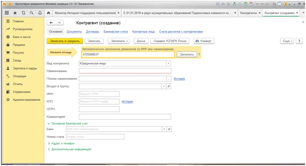 При нажатии кнопки «Создать» всплывает окно для формирования карточки нового контрагента. В ячейке «Автоматическое заполнение реквизитов по ИНН или наименованию» вводите имеющиеся у вас сведения и нажимаете кнопку «Заполнить». Система автоматически заполняет карточку на основании сведений, находящихся в едином реестре юридических лиц: краткое и полное наименование организации, ОГРН, юридический адрес.