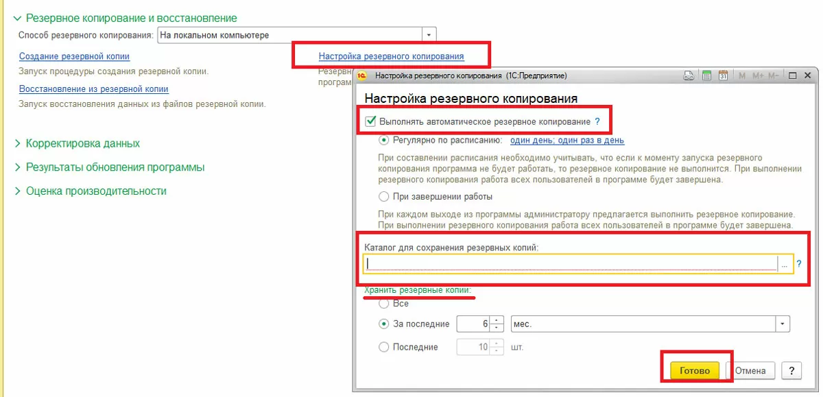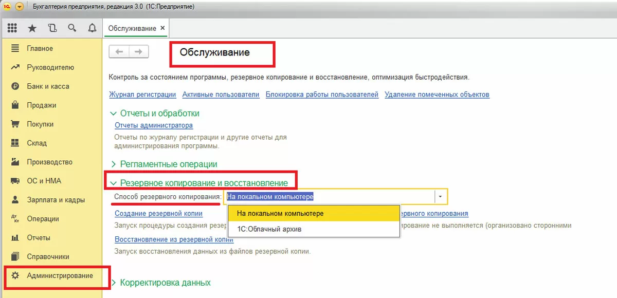 - В пункте «Резервное копирование и восстановление» указать способ резервного копирования (на локальном компьютере или в облачном архиве 1С);