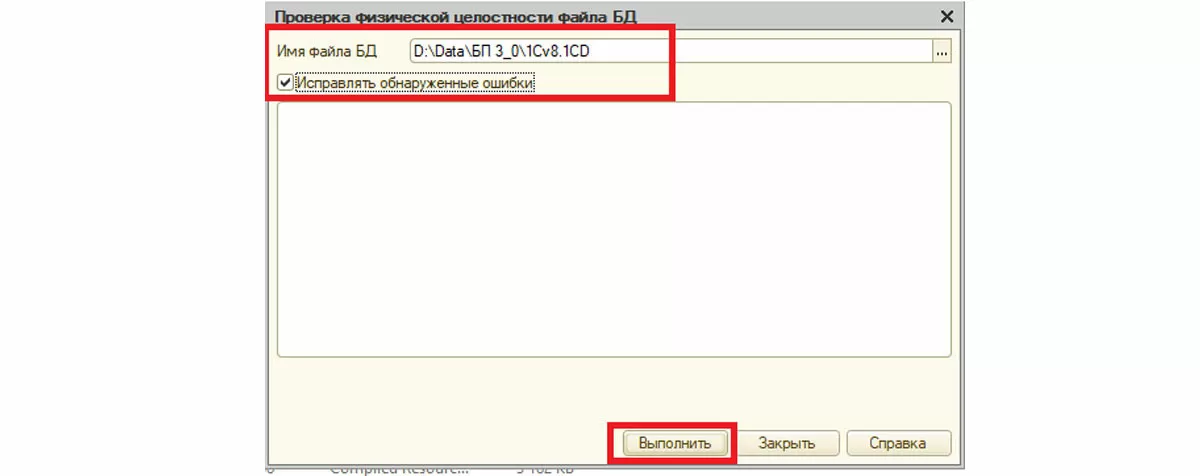 - В окне запуска укажем файл нашей базы данных и установим флаг «Исправлять обнаруженные ошибки» и жмем «Выполнить».