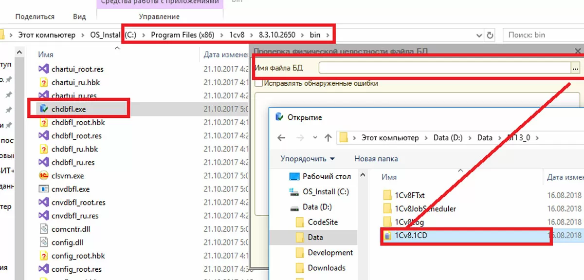 - Проверить файл базы утилитой Chdbfl.exe – поставляется в составе программного продукта, хранится в Program Files, в каталоге 1cv8/папка с номером текущей платформы (например, 8.3.10.2650 / bin).