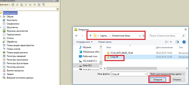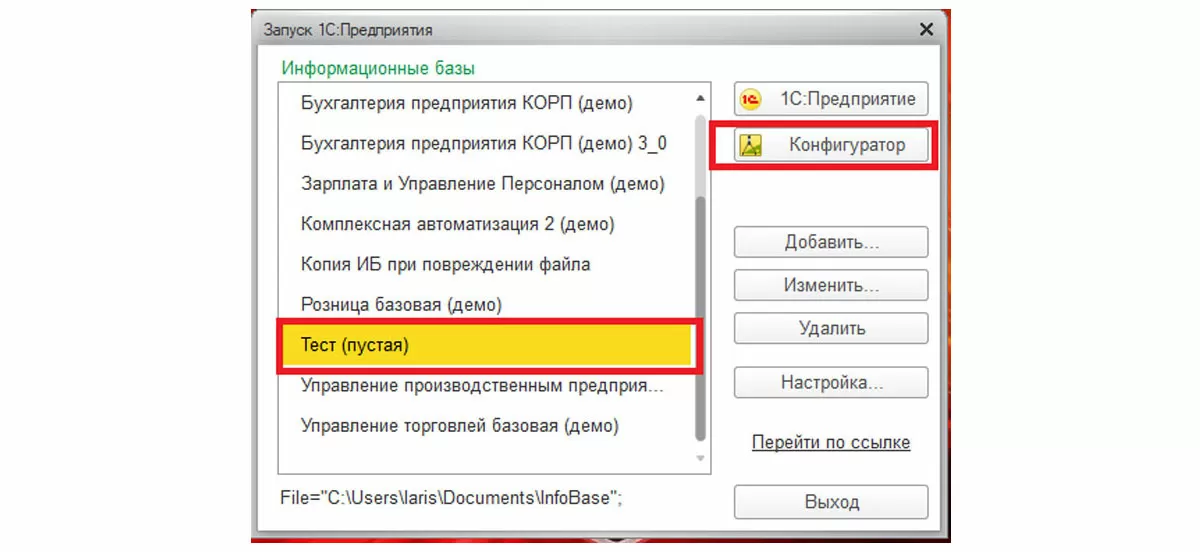 - Открыть вновь созданную пустую базу в режиме «Конфигуратор»;