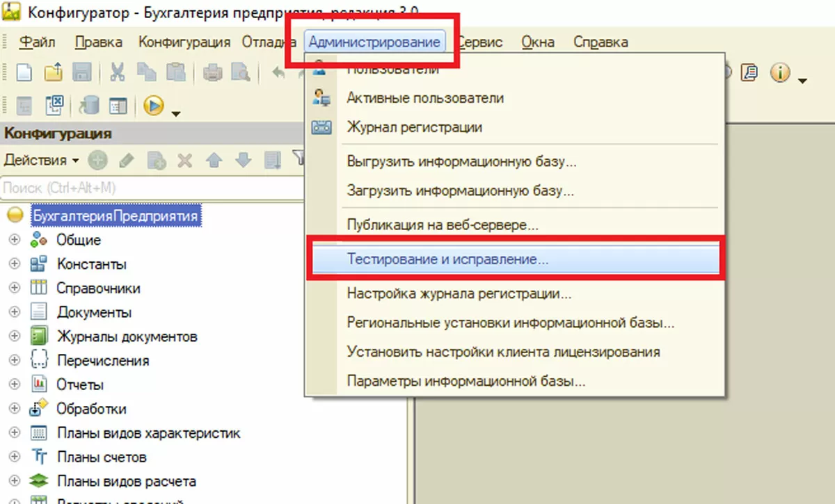 - В разделе меню «Администрирование» выбрать пункт «Тестирование и исправление»;