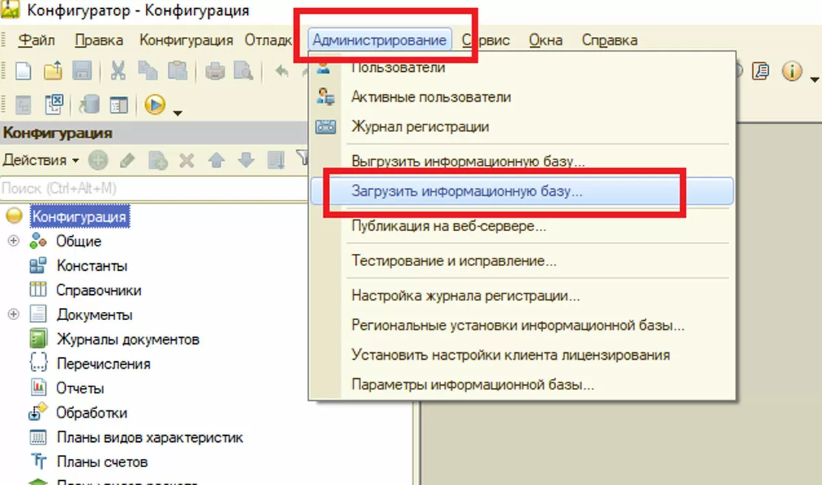 - В главном меню выбрать раздел «Администрирование»/«Загрузить информационную базу»;