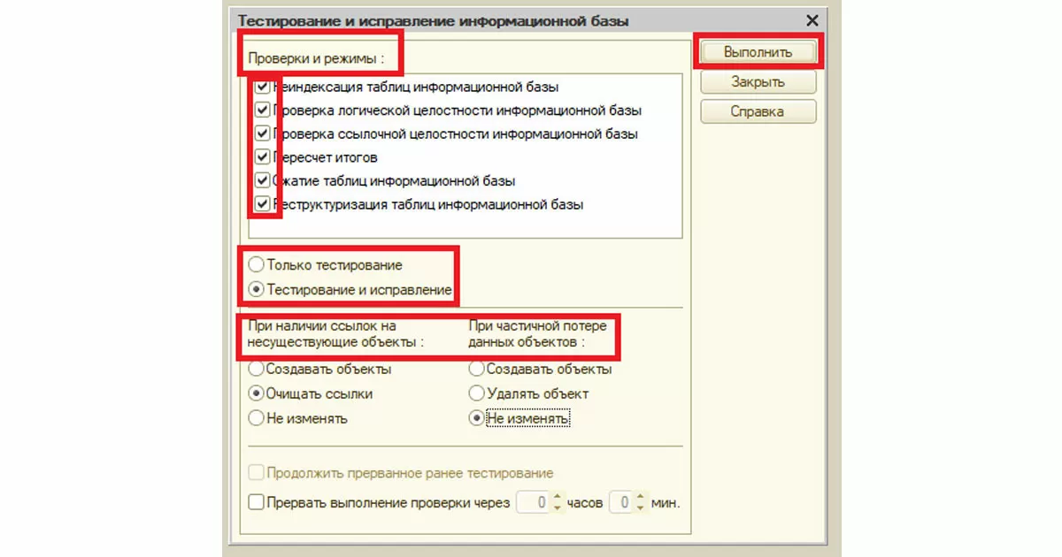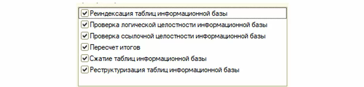 - Реиндексация таблиц информационной базы – полное перестроение индексов для заданных таблиц. Эта процедура существенно повышает производительность системы, поэтому рекомендуем выбрать ее при тестировании;