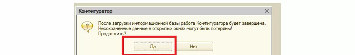 - Система сообщит о закрытии конфигуратора после загрузки и возможной утрате несохраненных данных в открытых окнах. Так как файл резервной копии загружается в пустую базу, предупреждение о несохраненных данных принимаем, нажимаем кнопку «Да»;