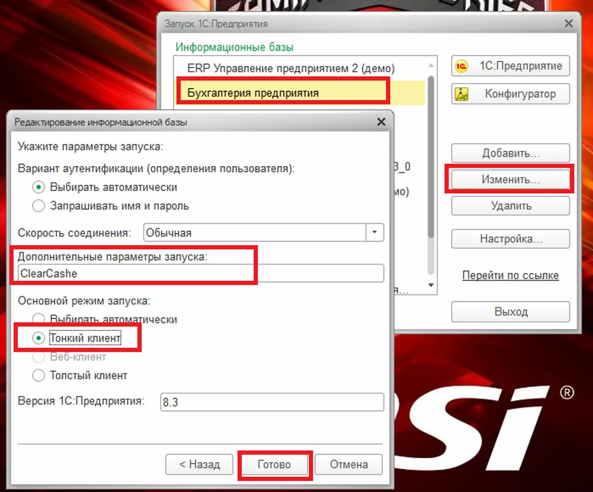 При частых случаях некорректной работы системы 1С 8 можно использовать в настройках запуска дополнительный параметр ClearCashe. К неудобствам его использования следует отнести доступность работы системы только на тонком клиенте и снижение производительности работы.