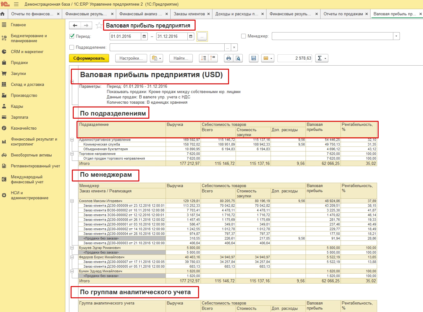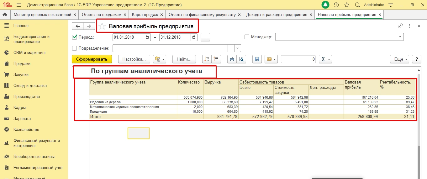 Проведение анализа мы рассмотрим на примере 1С:ERP Управление предприятием и 1С:Управление холдингом – решений для комплексной автоматизации крупных предприятий, консолидировать данные по продажам которых вручную не представляется возможным. В этих программных продуктах есть все необходимые отчеты, которые помогут провести качественный и быстрый факторный анализ прибыли от продаж, а также проанализировать каждый фактор в отдельности. О других программах 1С для учета денежных средств также можно прочитать на нашем сайте.