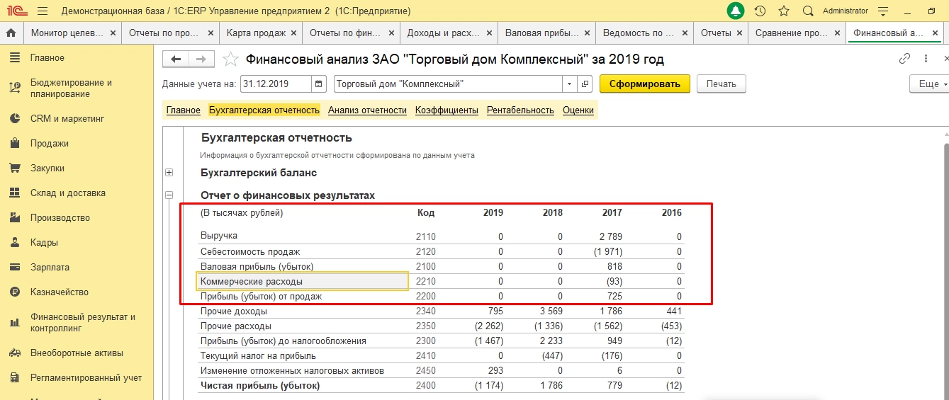 Так как при расчете прибыли с продаж учитывается не только себестоимость, но и коммерческие и управленческие расходы, можно сделать вывод, что при неконтролируемом росте данных расходов прибыль будет уменьшаться, поэтому важно их контролировать и анализировать. Для этого можно воспользоваться отчетом «Финансовый анализ», который предустановлен в обоих программных продуктах.